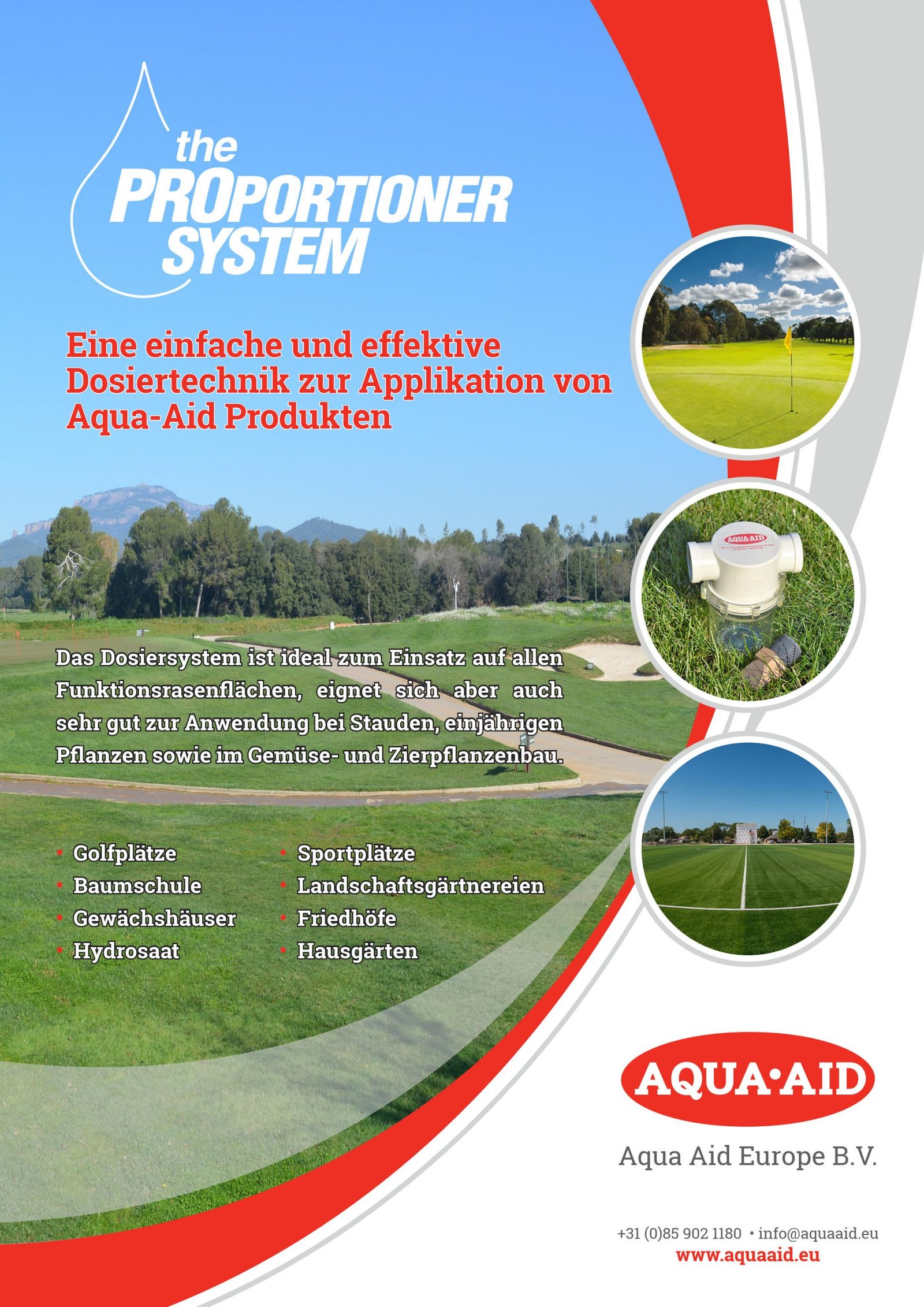 Das PROportioner-System ist eine einzige, nicht mischbare Methode zur Anwendung von Aqua Aid Produkten. Es ist speziell für den Einsatz auf allen Arten von Rasen, Stauden, Einjährigen, Gemüse und Zierpflanzen wie Golfplätzen, Sportplätzen, Landschaftsbepflanzung, Hausgärten, Hydro-Saatgut, Gewächshäusern, Umpflanzungen usw. konzipiert.